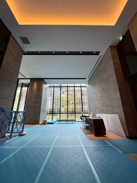 タイル調の床が光を受けて淡く反射する空間...